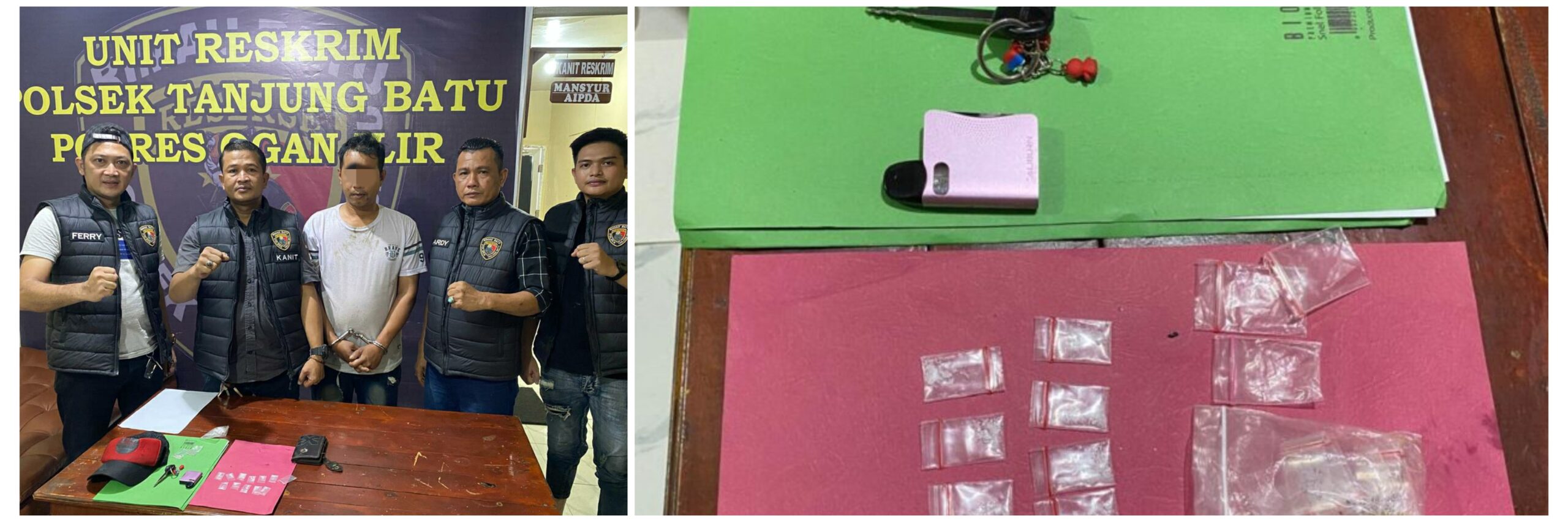 * Polsek Tanjung Batu berhasil mengungkap kasus tindak pidana peredaran narkotika di wilayah hukumnya pada Jumat (18/07/2025) sekitar pukul 13.30 WIB. Dalam penindakan tersebut, seorang pelaku berinisial A.P. (36), warga Desa Tanjung Tambak Baru, Kecamatan Tanjung Batu, berhasil diamankan saat hendak melakukan transaksi narkoba jenis sabu.Penangkapan berlangsung di sekitar lapangan sepak bola Desa Seribandung, Kecamatan Tanjung Batu, Kabupaten Ogan Ilir, setelah Unit Reskrim Polsek Tanjung Batu menerima informasi dari masyarakat. Operasi penangkapan ini dipimpin langsung oleh Kapolsek Tanjung Batu, IPTU Dr. Syaparudin Akso, S.H., M.Si., CPHR, CHT, bersama Kanit Reskrim Aipda Mansyur dan Kanit Propam Aipda Ujang Syafrullah, S.H., serta tim Rimau Batu Polsek Tanjung Batu.