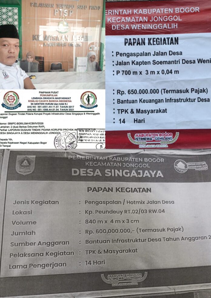 Laporan tersebut mengungkap indikasi kuat terjadinya penyimpangan anggaran pada proyek infrastruktur di dua desa, yakni Desa Singajaya dan Desa Weninggalih, Kecamatan Jonggol. Nilai dugaan kerugian negara yang teridentifikasi tidak main-main, mencapai ratusan juta rupiah dengan pola yang disebut “terstruktur sejak tahap perencanaan”.