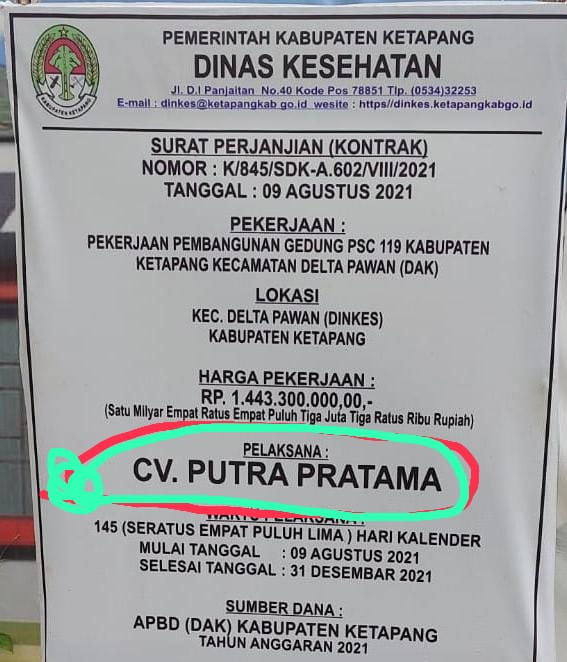 Terindikasi Kepala Dinas Kesehatan dan pelaksana bermain cong kalicong untuk menghantam uang Negara modus proyek abal-abal yang mana dalam pelaksanaan maupun pengadaan satuan barang/jasa dalam pembangunan proyek Pemerintah secara langsung proyek Pemerintah Kab.Ketapang gagal terlambat waktu dalam Pelaksanaannya serta disinyalir proyek maling uang Negara, pelaksana proyek tak punya modal mengandalkan uang DP dalam mendapatkan kontrak tersebut.