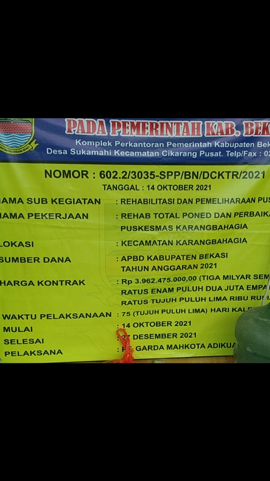 Proyek rehab pembangunan poned puskesmas Karang Bahagia Kecamatan Karang Bahagia Kabupaten Bekasi yang anggarannya dari APBD tahun 2021 yang di kerjakan oleh PT Mahkota Adikuasa di duga mencuri aliran listrik milik Perusahaan Listrik Negara ( PLN ) Senin 1 / 11 / 2021.