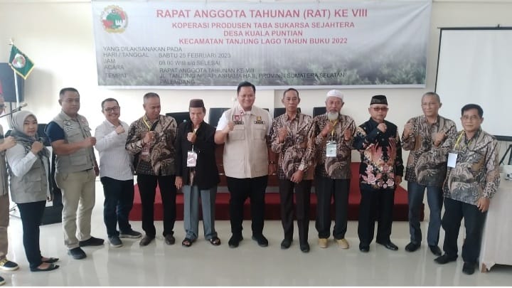 Rapat Angka Tahunan (Rat) ke VIII, Koperasi Produsen Taba Sukarsa Sejahtera Desa Kuala Puntian, Kecamatan Tanjung Lago yang pelasanaannya di gedung Asrama Haji Kota Palembang, Sabtu,(25-2-2023).
