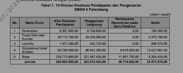Selama tahun 2023, SMKN 6 menerima pendapatan sebesar Rp369.603.900, yang sebagian besar kemudian digunakan langsung oleh internal sekolah tanpa mekanisme penyetoran resmi.