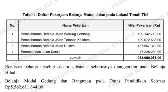 BPK menemukan, belanja pembangunan jalan senilai Rp933 juta justru dilakukan di atas lahan milik TNI. Secara aturan, ini bukan belanja modal, melainkan belanja hibah kepada pihak lain. Artinya, sejak awal sudah terjadi kekeliruan mendasar dalam penganggaran.