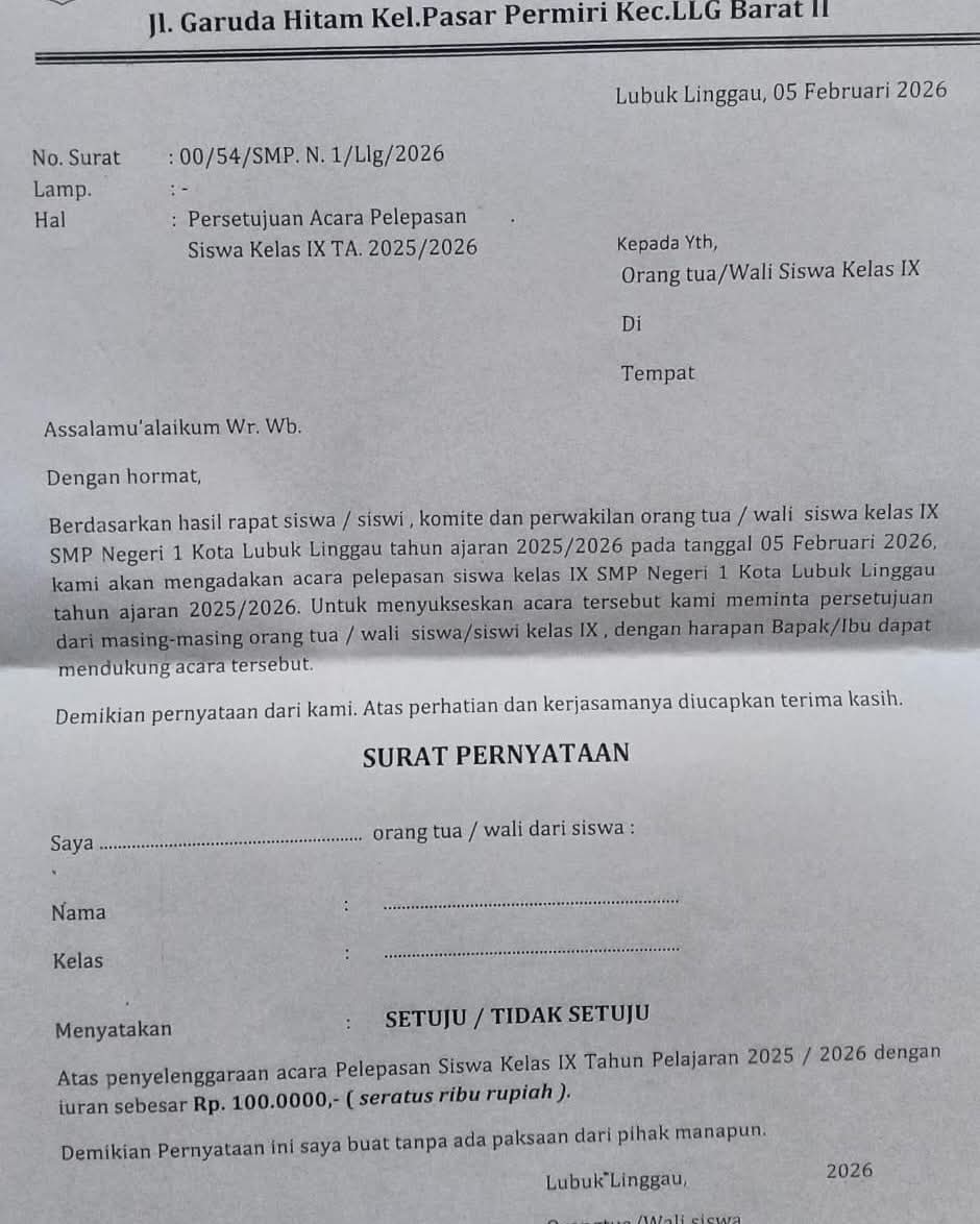 Lubuklinggau — menyoroti kebijakan iuran kegiatan pelepasan siswa kelas IX SMP Negeri 1Kota Lubuklinggau tahun ajaran 2025/2026 sebesar Rp100.000 per siswa. Kebijakan tersebut dinilai bertentangan dengan peraturan perundang-undangan dan berpotensi memberatkan wali murid.