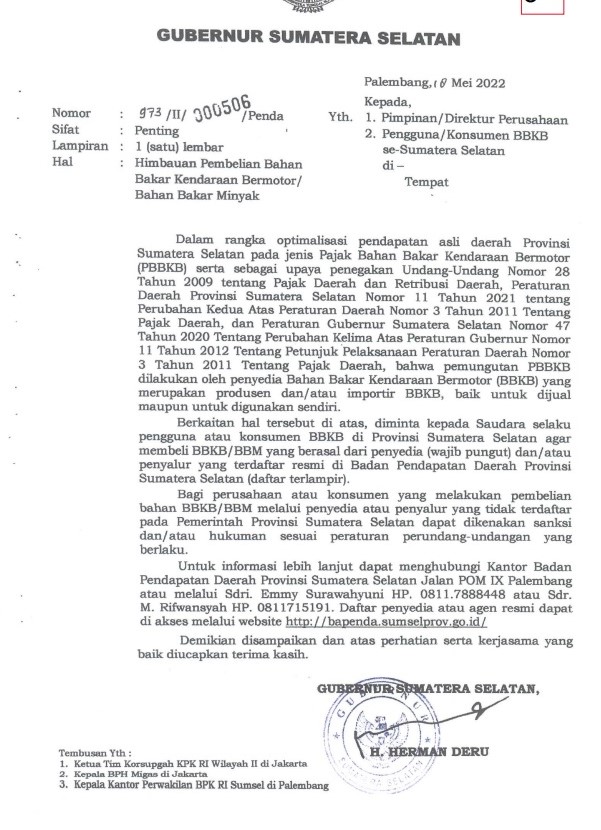 Namun berdasarkan informasi dari masyarakat bahwasanya telah ada tender dan tertutup. Pemenang tender tersebut diduga telah diatur dan diduga tidak berizin suplay bbm serta mirisnya lagi PT tersebut tidak terdaftar dalam vendor list bbm Sumsel yang mana menyebabkan hilangnya potensi PAD Sumsel.