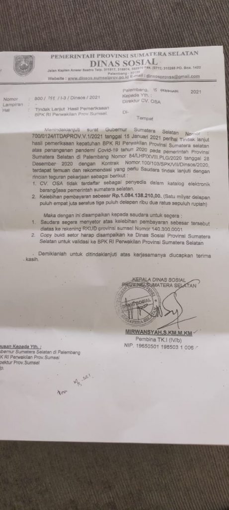 Pasalnya pihak BPK.RI.Perwakilan Sumatera Selatan telah berhasil menemukan kelebihan pembayaran ke CV. OSA sebesar Rp 1.084.138.210. ironisnya CV.OSA tidak terdaftar dalam E.katalog barang dan jasa pemerintah Sumsel hal tersebut telah ditindak lanjuti oleh Pihak Divisi pengawasan dan penindakan aset negara korwil WRC (Watch Relation of Corruption) Sumatra Selatan yang sudah berusaha untuk klarifikasi terkait adanya kerugian negara di Dinsos Provinsi Sumatera Selatan secara tertulis.
