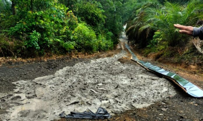 Tampak hamparan pengerasan batu sangat tipis, sehingga saat ditimpa hujan, batu pengerasan tersebut bercampur aduk dengan lumpur.