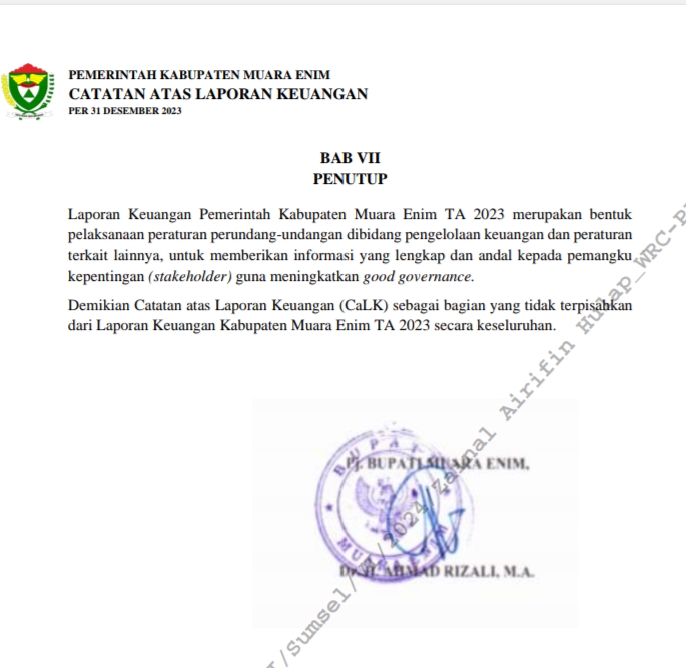 sebesar Rp905.296.146.233,22 atau 88,92% dari anggaran. Menurut Ali Sopyan dengan tegas suwara lantang hal tersebut akan di ungkapkan di jalur aparat penegak hukum diker akan ada indikasi tindak pidana korupsi sesuwai , Dalam Laporan Hasil Pemeriksaan (LHP) atas Belanja Daerah TA 2023 pada Pemerintah Kabupaten Muara Enim Nomor 08/LHP/XVIII.PLG/01/2024 tanggal 15 Januari 2024, BPK mengungkapkan permasalahan sebagai berikut.