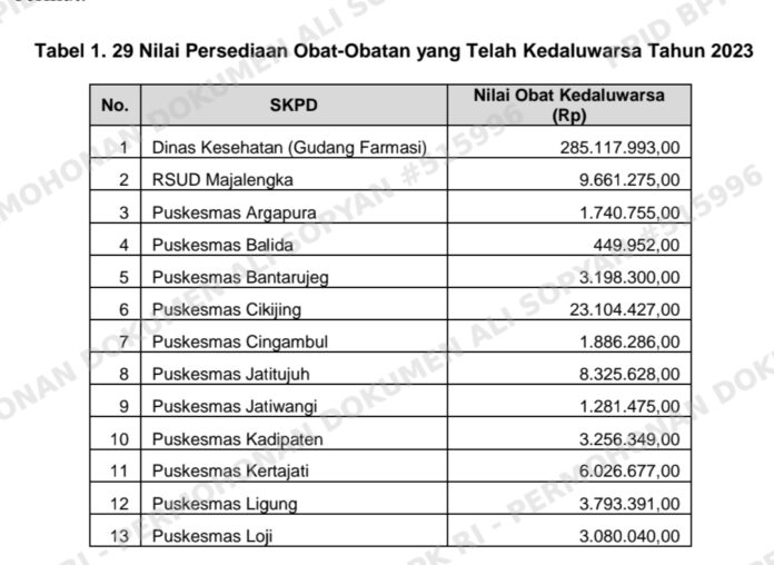 Berdasarkan hasil pemeriksaan terdapat obat-obatan dan BMHP yang kedaluwarsa yang tersebar pada gudang farmasi dinkes, 29 Puskesmas dan RSUD Majalengka dengan nilai sebesar Rp442.891.458,00, dengan rincian sebagai berikut.