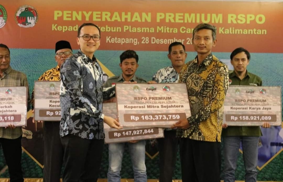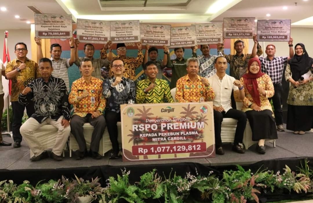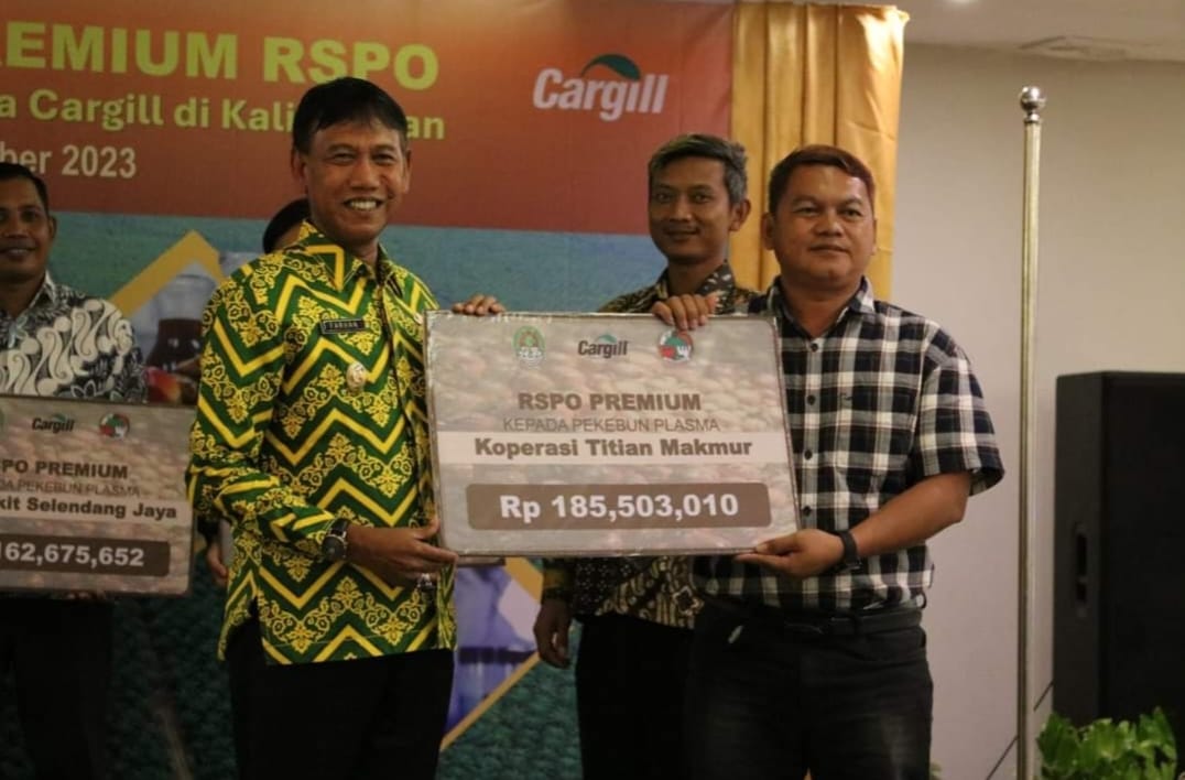 Sebanyak hampir Rp 1 miliar lebih Premium Roundtable Sustainability Palm Oil (RSPO) diberikan perusahaan perkebunan Cargill kepada Pekebun Plasma Mitra Cargil yaitu 8 koperasi di lingkungan perusahaannya, Kamis (8/12/2023).