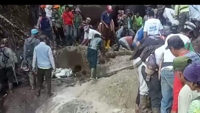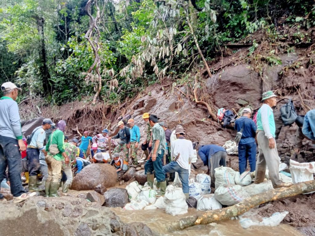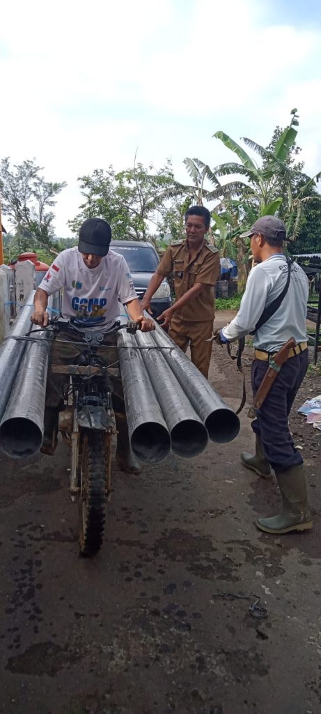 Dengan Semangat yang tinggi Warga Desa Sukaraja Memperbaiki Tanggul dengan Peralatan dan Material Seadanya Agar Bisa Mendapatkan Air Bersih Kembali,